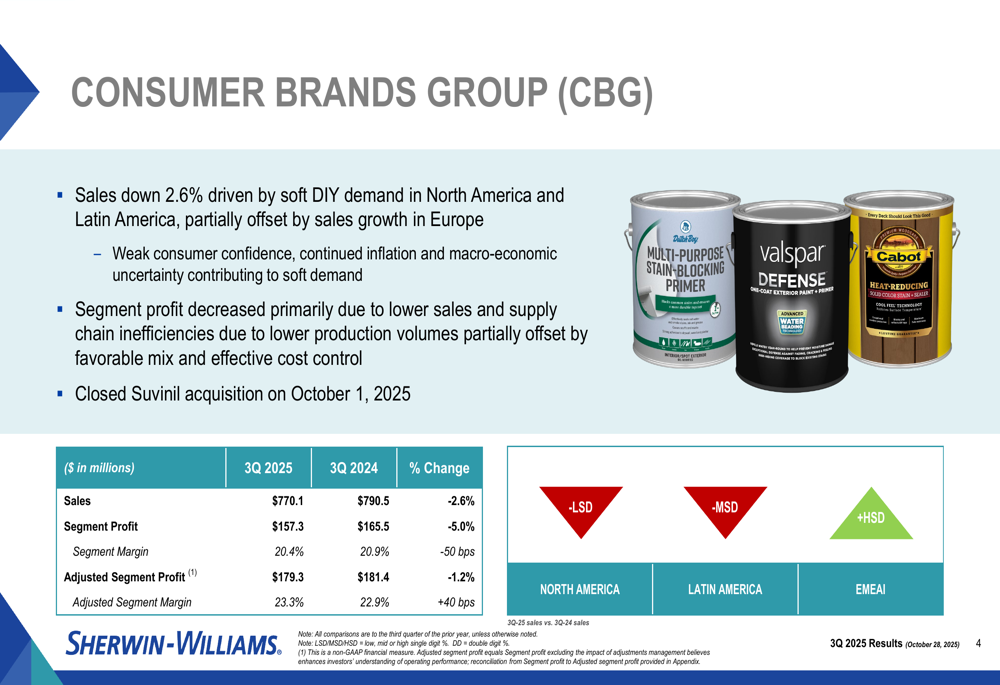 2. Aquisições estratégicas: A aquisição da Suvinil foi concluída em 1º de outubro de 2025, fortalecendo a posição da Sherwin-Williams na América Latina apesar da atual fraqueza nesse mercado.