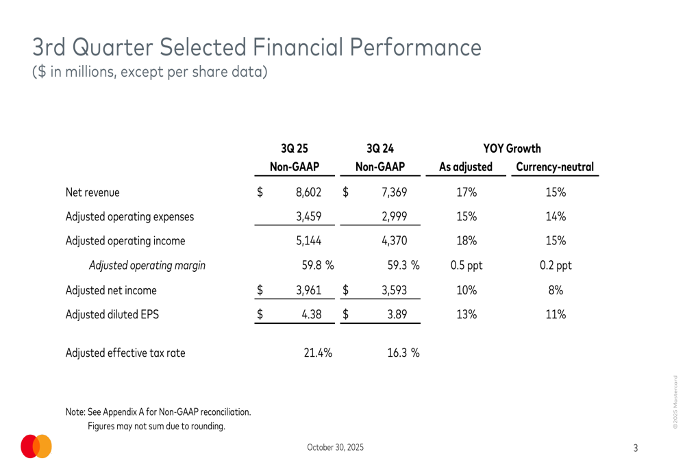 A Mastercard entregou resultados financeiros robustos em todos os principais indicadores no terceiro trimestre de 2025. A empresa reportou lucro líquido ajustado de US$ 3.961 milhões, representando um aumento de 10% (8% em base neutra de moeda) em comparação ao mesmo período do ano anterior. O lucro por ação diluído ajustado alcançou US$ 4,38, um aumento de 13% (11% neutro de moeda) em relação aos US$ 3,89 no 3º tri 2024, superando a previsão de US$ 4,32.