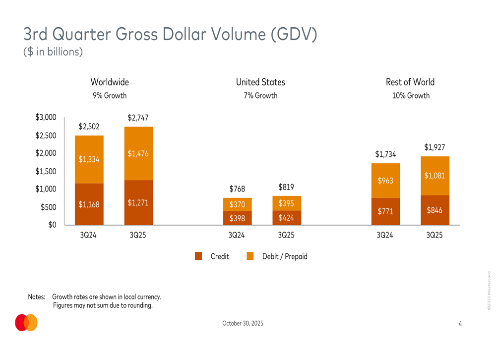 O volume bruto em dólares (GDV) da Mastercard atingiu US$ 2.747 bilhões no 3º tri 2025, representando um aumento de 9% em moeda local em relação ao ano anterior. Os Estados Unidos registraram crescimento de 7%, enquanto o resto do mundo experimentou um aumento mais forte de 10%. As transações de crédito continuaram superando as transações de débito e pré-pagas em ambas as regiões.