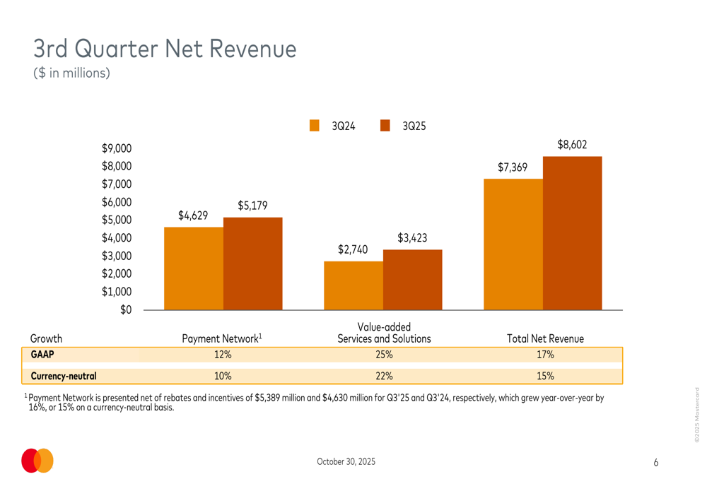 A receita líquida subiu para US$ 8.602 milhões, um aumento de 17% (15% neutro de moeda) em relação aos US$ 7.369 milhões no terceiro trimestre de 2024. Este crescimento foi impulsionado pelo forte desempenho tanto no segmento de rede de pagamentos quanto nos serviços de valor agregado.