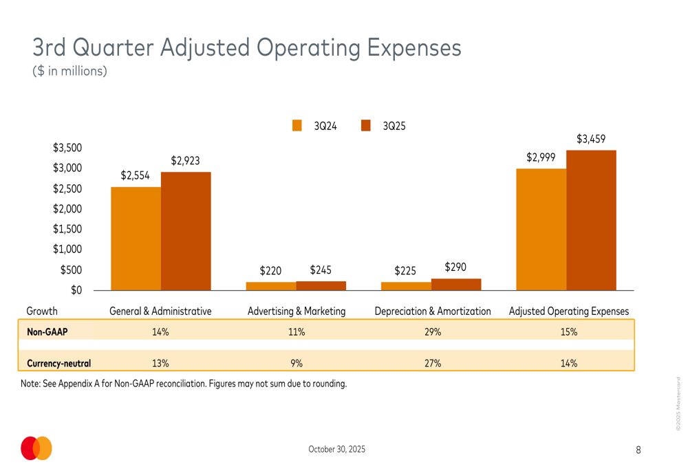 As despesas operacionais aumentaram 15% (14% neutro de moeda) para US$ 3.459 milhões, impulsionadas principalmente por um aumento de 14% nas despesas gerais e administrativas e um aumento de 29% na depreciação e amortização. A empresa manteve disciplina de custos em publicidade e marketing, que cresceu de forma mais modesta, 11%.