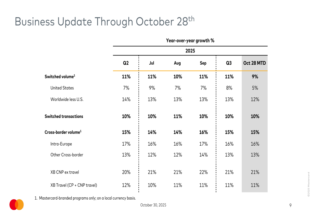 O volume transfronteiriço, um importante impulsionador de crescimento para a Mastercard, mostrou desempenho particularmente forte com crescimento de 15% até 28 de outubro. Esta métrica é especialmente importante, pois as transações transfronteiriças geralmente geram maior receita para a empresa.