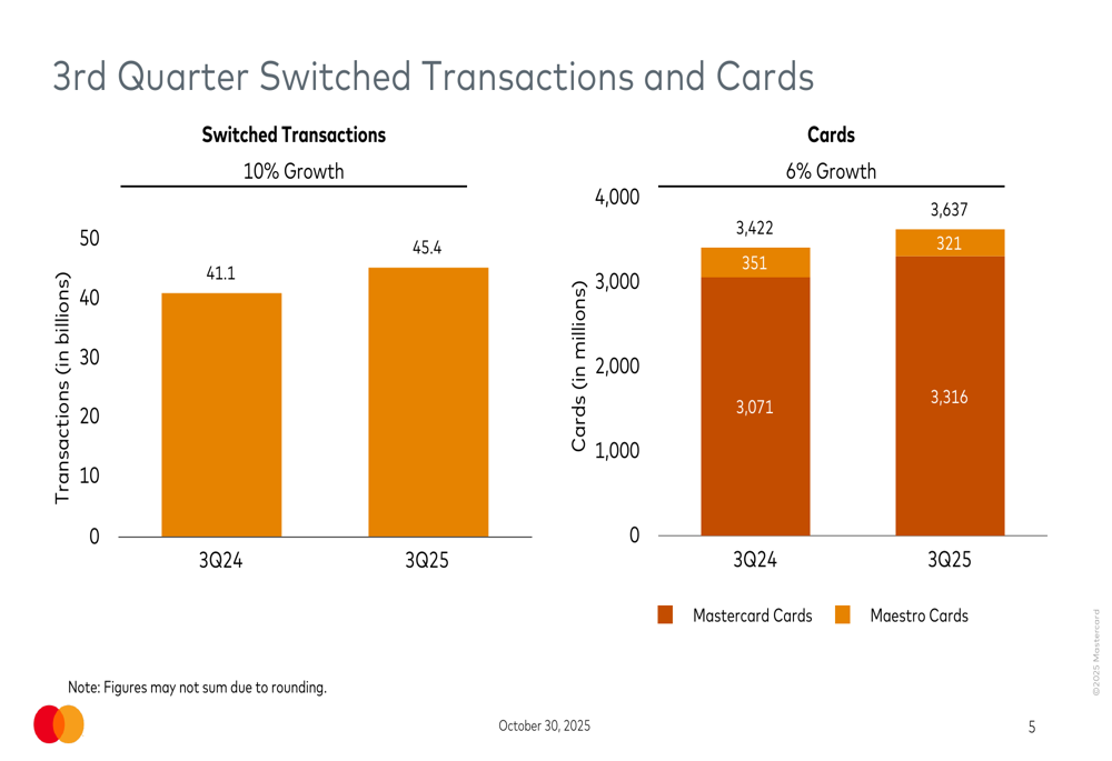 O volume de transações também mostrou crescimento saudável, com transações processadas aumentando 10% para 45,4 bilhões no 3º tri 2025, de 41,1 bilhões no 3º tri 2024. A base de cartões da empresa expandiu 6% para 3.637 milhões de cartões, com os cartões da marca Mastercard crescendo 8%, enquanto os cartões Maestro diminuíram 9%.