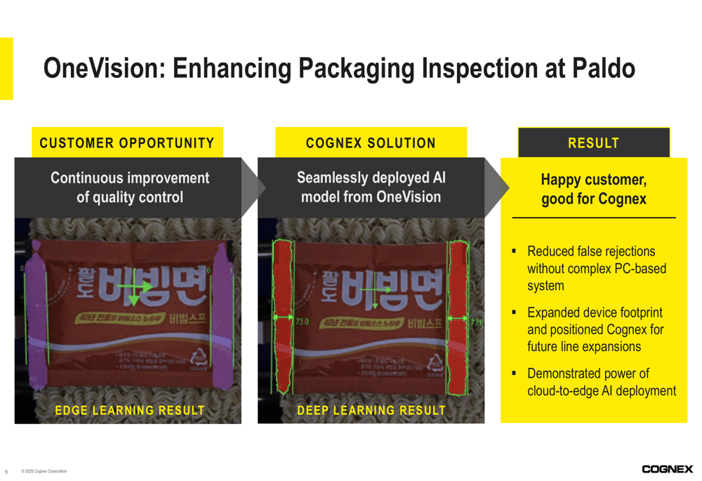 Um desenvolvimento-chave destacado na apresentação foi o lançamento do OneVision, uma plataforma em nuvem para visão computacional impulsionada por IA. A empresa apresentou um estudo de caso demonstrando como essa tecnologia aprimorou a inspeção de embalagens para um cliente chamado Paldo: