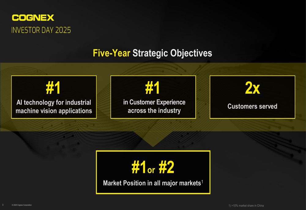 A apresentação da Cognex enfatizou seu foco estratégico na tecnologia de IA e aplicações de visão computacional, delineando objetivos ambiciosos para cinco anos: