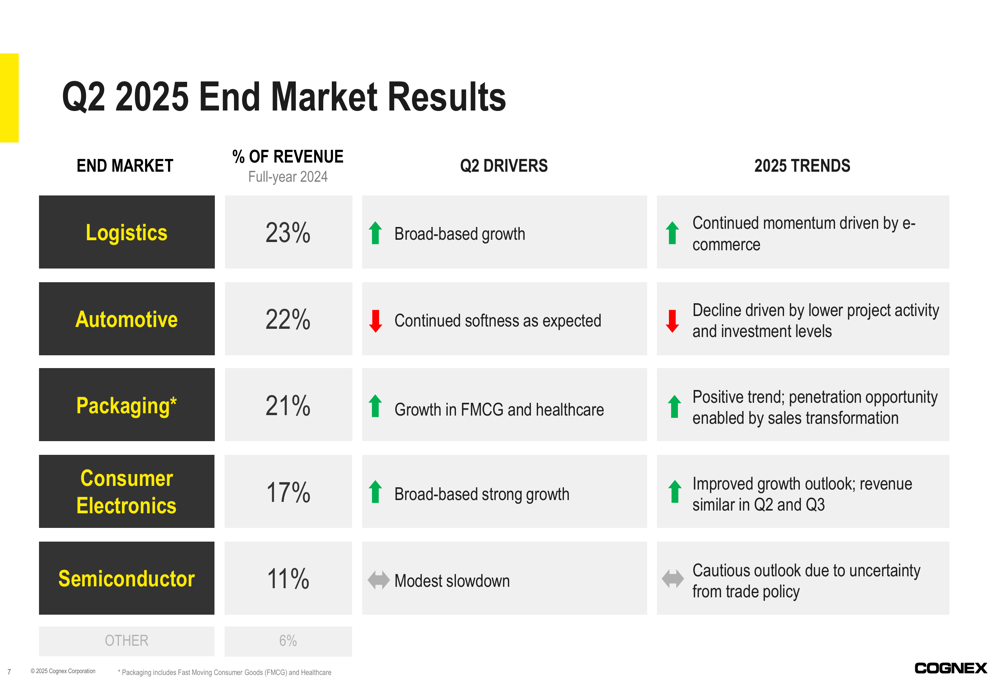 O desempenho da Cognex variou significativamente entre seus mercados finais, com logística e eletrônicos de consumo impulsionando o crescimento, enquanto os setores automotivo e de semicondutores enfrentaram desafios.