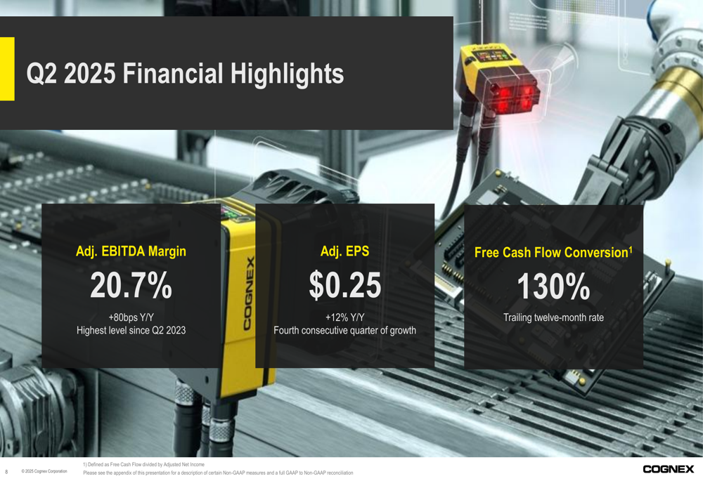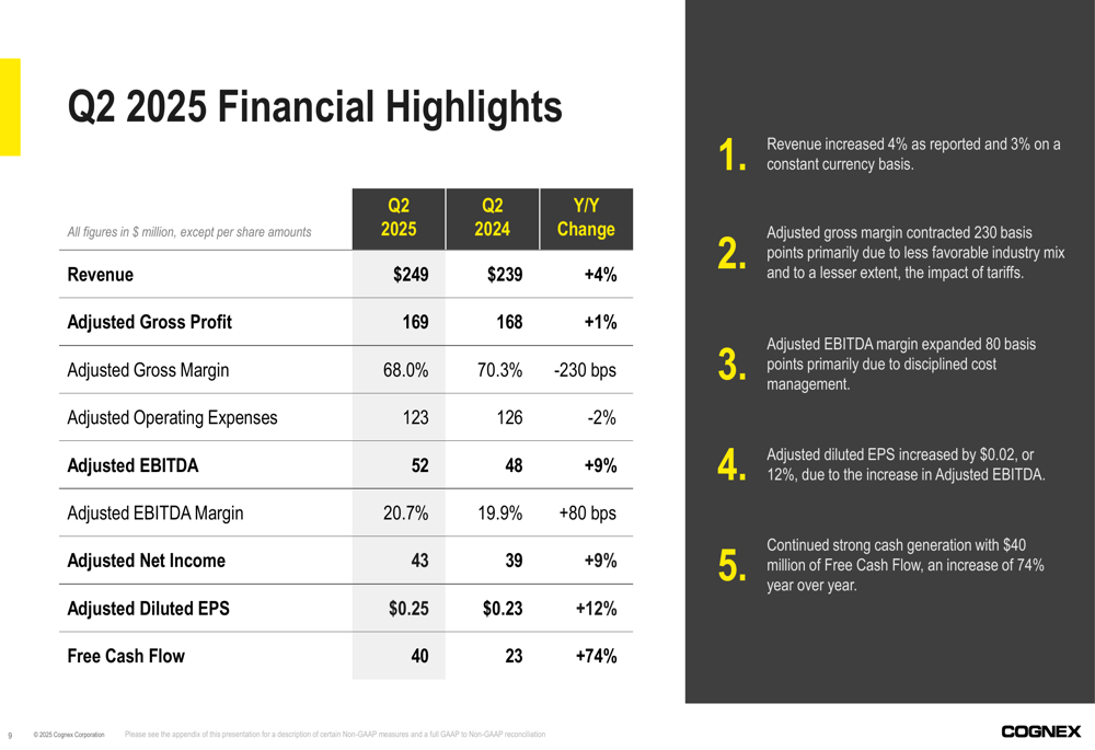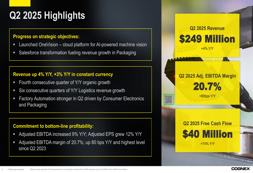 A Cognex reportou receita de US$ 249 milhões no 2º tri de 2025, representando um aumento de 4% ano a ano (3% em moeda constante). A empresa alcançou uma margem EBITDA ajustada de 20,7%, expandindo 80 pontos base ano a ano para atingir seu nível mais alto desde o 2º tri de 2023.