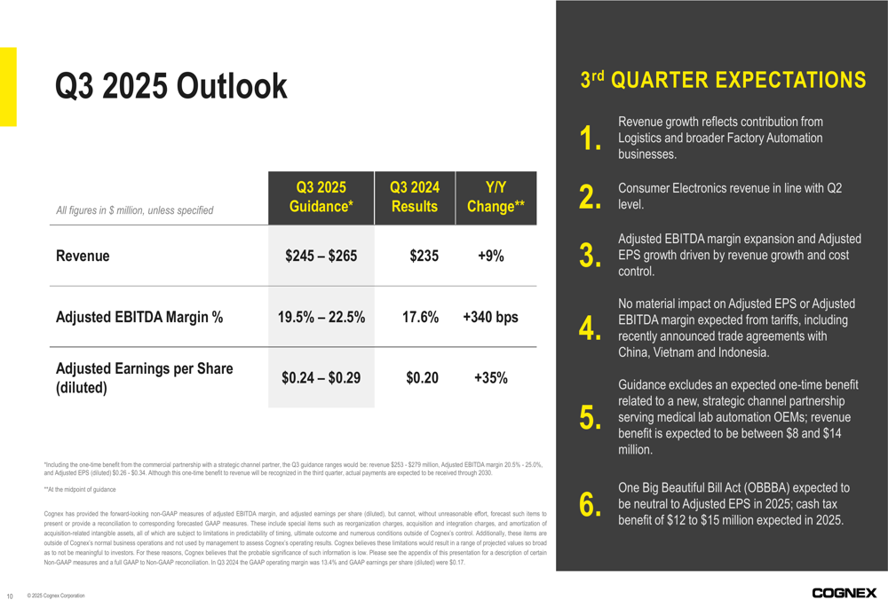 Olhando para o 3º tri de 2025, a Cognex forneceu uma perspectiva otimista com expectativas de crescimento contínuo: