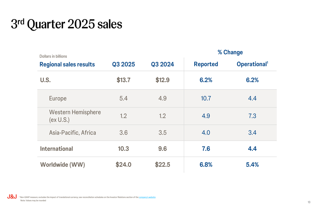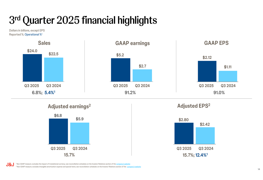 A Johnson & Johnson reportou vendas globais de US$ 24,0 bilhões para o 3º tri 2025, representando um aumento de 6,8% reportado e 5,4% operacional em relação ao ano anterior. O lucro por ação diluído da empresa disparou 91,0% para US$ 2,12, enquanto o LPA diluído ajustado cresceu 15,7% para US$ 2,80, superando as expectativas dos analistas de US$ 2,76.