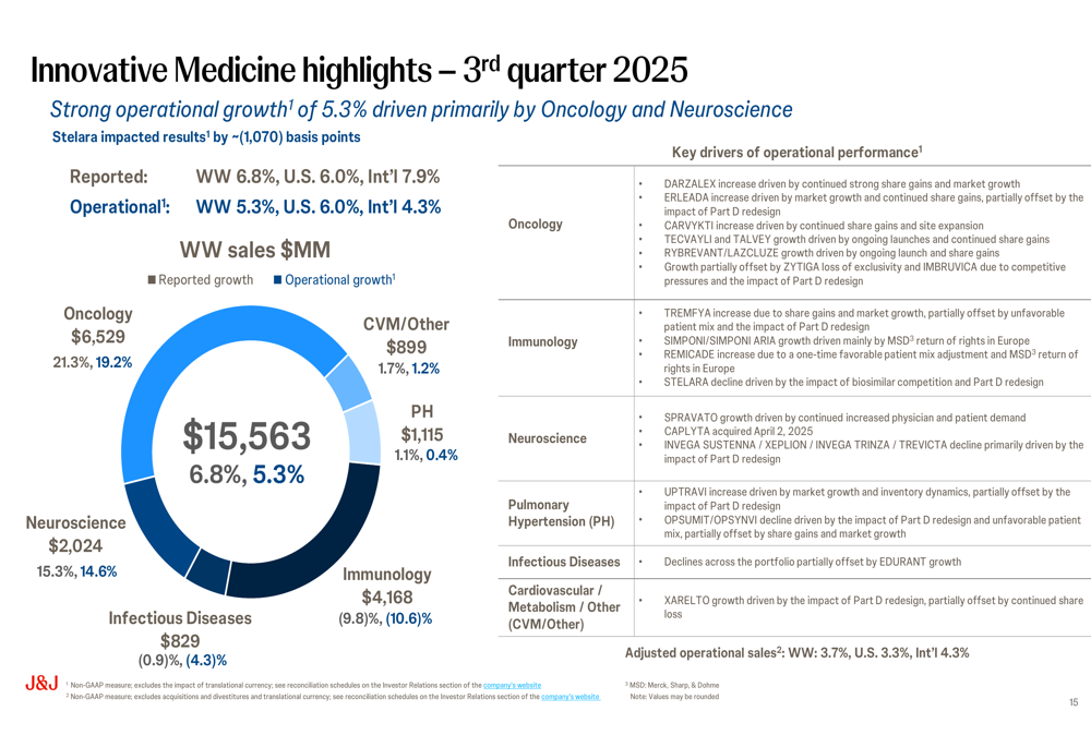 O segmento de Medicina Inovadora da Johnson & Johnson, que representa aproximadamente 65% das vendas totais, gerou US$ 15,6 bilhões no 3º tri 2025, um aumento de 6,8% em base reportada e 5,3% operacionalmente. O desempenho do segmento foi impulsionado pelo forte crescimento em Oncologia e Neurociência, parcialmente compensado por declínios em Imunologia devido aos desafios do Stelara.