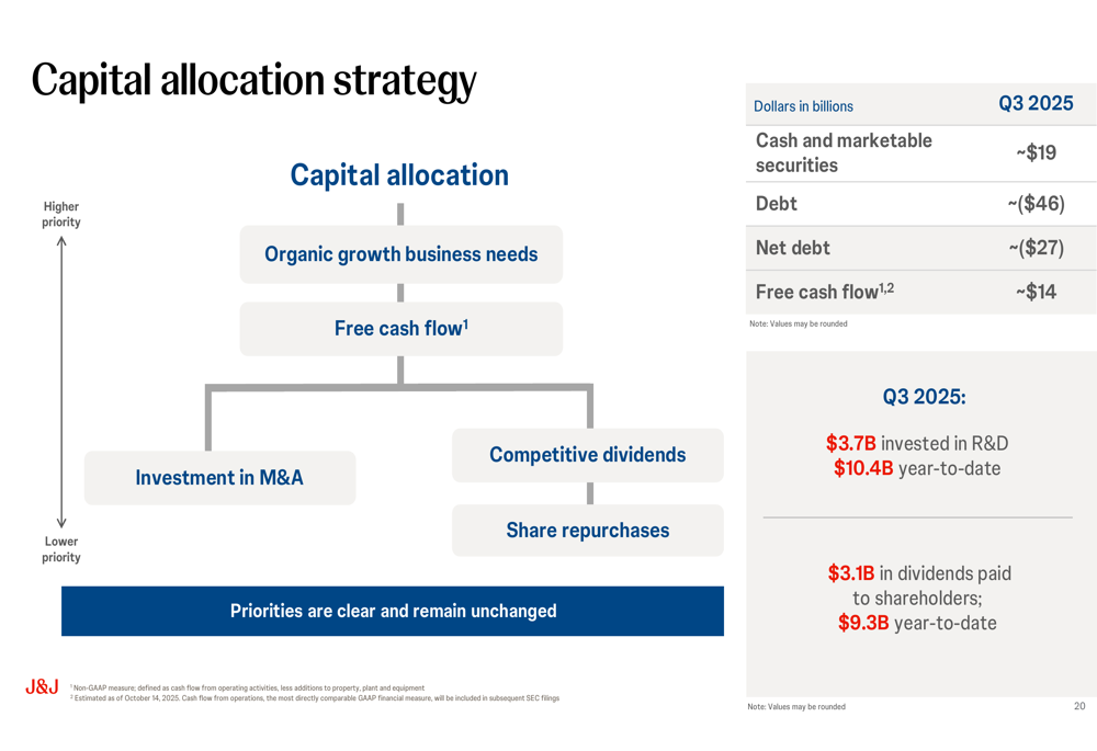 No 3º tri 2025, a J&J investiu US$ 3,7 bilhões em P&D (US$ 10,4 bilhões no acumulado do ano) e distribuiu US$ 3,1 bilhões em dividendos (US$ 9,3 bilhões no acumulado do ano). A empresa reportou aproximadamente US$ 19 bilhões em caixa e títulos negociáveis, com dívida líquida de cerca de US$ 27 bilhões.