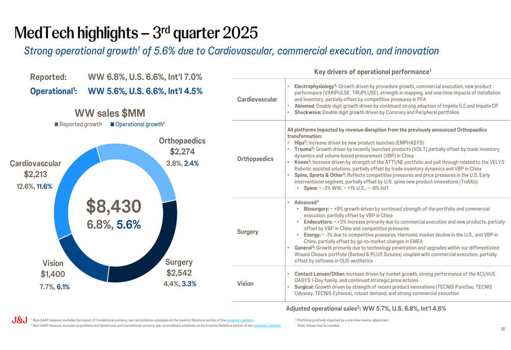 Cardiovascular liderou o crescimento do MedTech com um aumento reportado de 12,6% (11,6% operacional) para US$ 2,2 bilhões, impulsionado por Eletrofisiologia, Abiomed e Shockwave. Visão e Ortopedia também apresentaram desempenho sólido, crescendo 7,7% e 3,8% em base reportada, respectivamente.