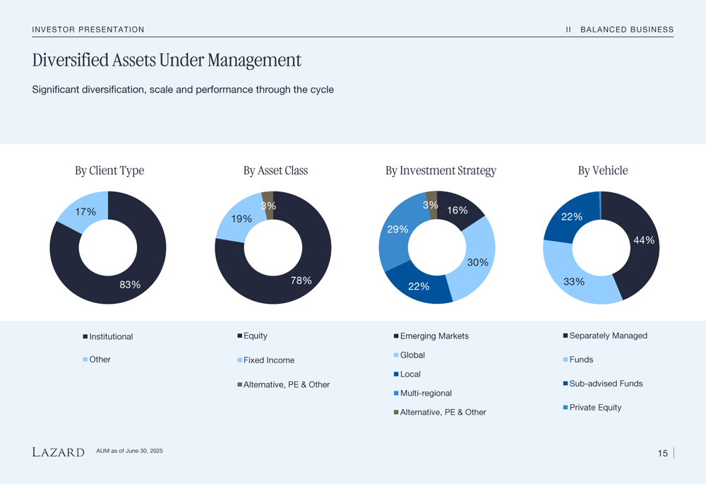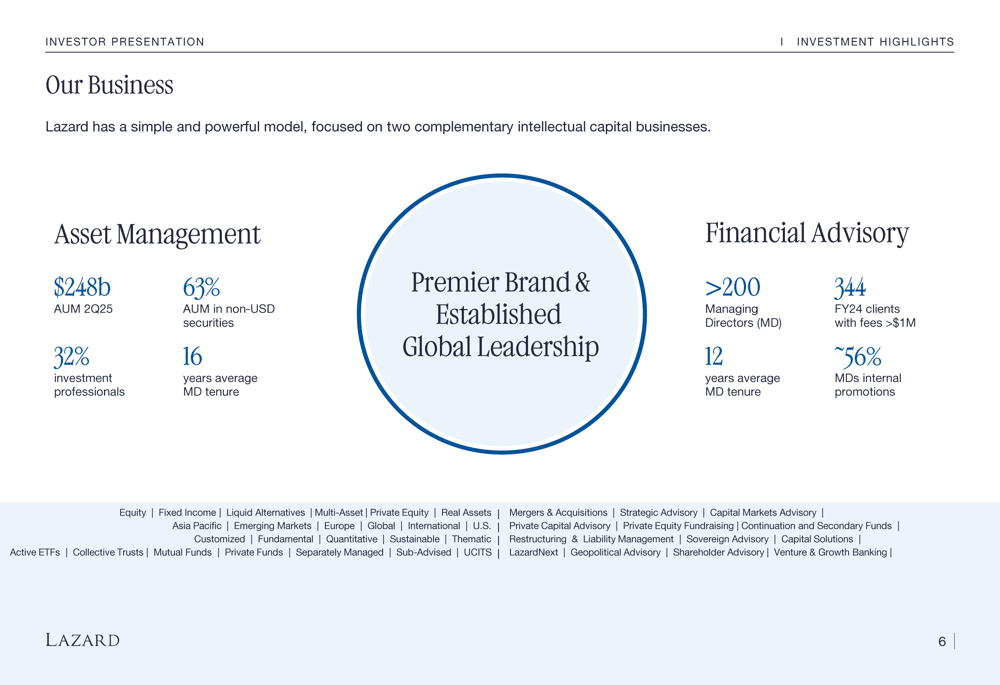 O modelo de negócios da Lazard continua equilibrado entre seus dois segmentos complementares: Consultoria Financeira e Asset Management. O alcance global da empresa e sua posição de liderança estabelecida fornecem uma base sólida para suas operações.