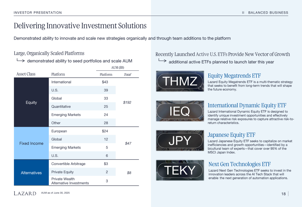 A inovação continua sendo uma área de foco chave para a Lazard, particularmente em seu negócio de Asset Management. A empresa lançou recentemente seus primeiros produtos ETF ativos no mercado americano, incluindo o Equity Megatrends ETF (THMZ), International Dynamic Equity ETF (IEQ), Japanese Equity ETF (JPY) e Next Gen Technologies ETF (TEKY).