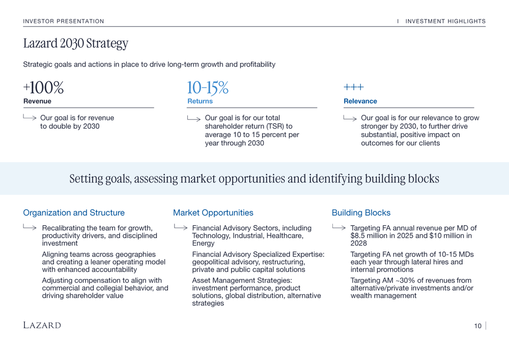 O slide a seguir ilustra a estratégia abrangente da Lazard para 2030: