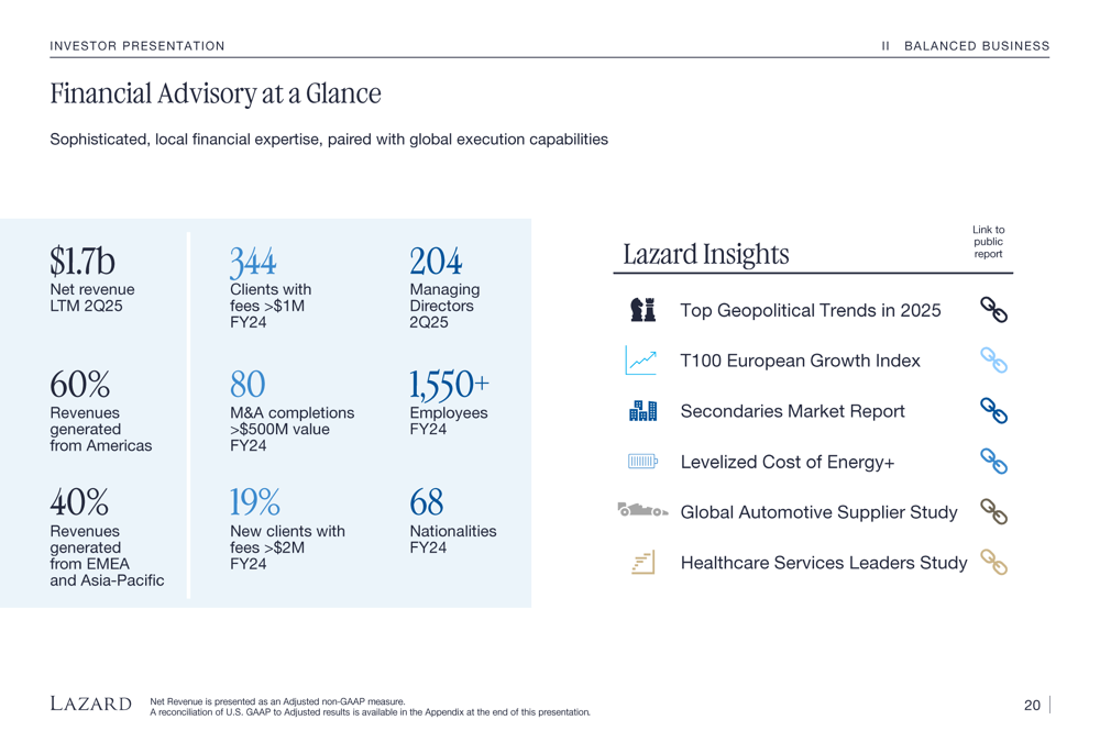 O negócio de Consultoria Financeira da Lazard continua sendo um importante impulsionador de crescimento, com 204 Diretores Executivos no 2º tri de 2025 e 344 clientes com honorários superiores a US$ 1 milhão no ano fiscal de 2024. A empresa concluiu 80 transações de fusões e aquisições avaliadas em mais de US$ 500 milhões cada no ano fiscal de 2024.