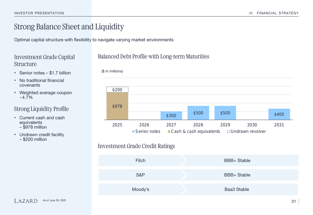 Os ativos sob gestão da firma estavam em US$ 248 bilhões no 2º tri de 2025, embora a média de AUM tenha diminuído ligeiramente de US$ 245 bilhões no 2º tri de 2024 para US$ 239 bilhões. No entanto, a Lazard conseguiu melhorar sua taxa média de administração de 43 pontos-base para 44 pontos-base durante o mesmo período.