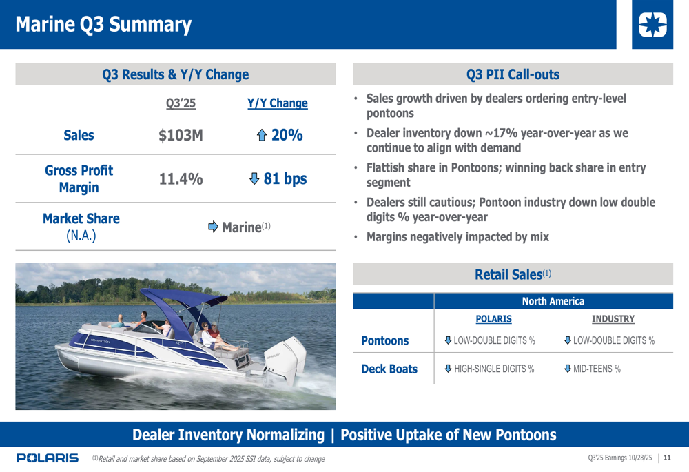 A Polaris reportou vendas ajustadas de US$ 1,84 bilhões para o 3º tri de 2025, representando um aumento de 7% em relação ao ano anterior e superando as expectativas dos analistas. A empresa registrou um lucro por ação ajustado de US$ 0,41, superando significativamente a previsão de US$ 0,23, embora isso ainda represente uma queda de 44% em relação ao ano anterior.