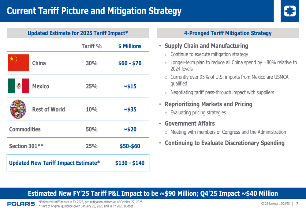 Um foco significativo da apresentação foram as tarifas, que estão criando obstáculos substanciais para a Polaris. A empresa detalhou sua estimativa atualizada para o impacto das tarifas em 2025, totalizando US$ 130-140 milhões em várias categorias, incluindo China (tarifa de 30%), México (tarifa de 25%) e commodities (tarifa de 50%).