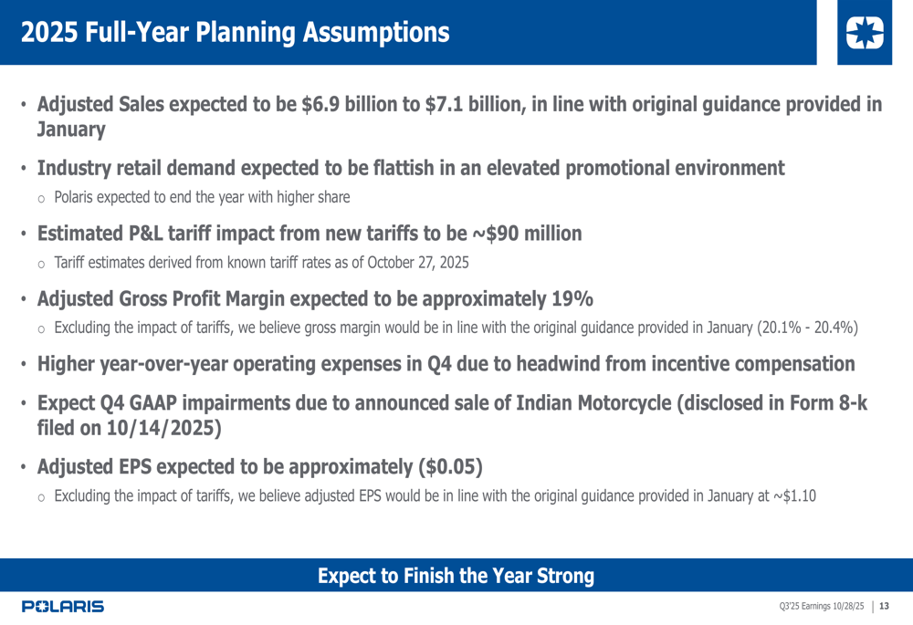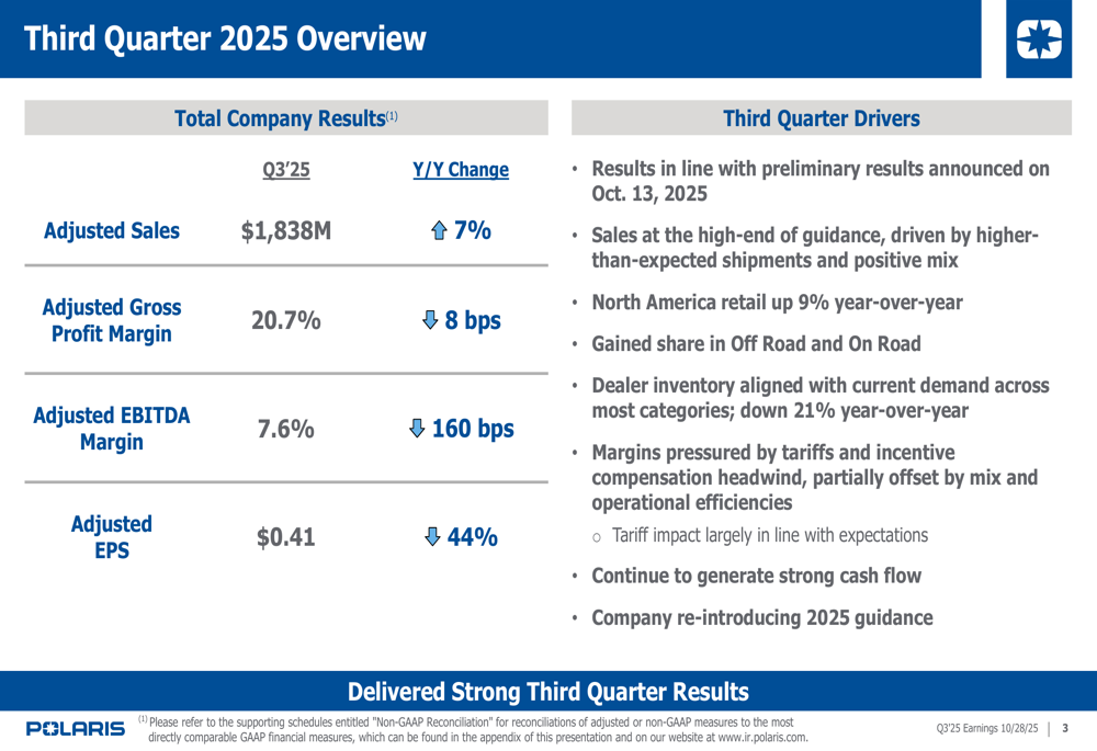 A Polaris Industries Inc. (Nova York:PII) apresentou seus resultados do terceiro trimestre de 2025 em 28 de outubro, revelando uma empresa que navega por desafios significativos enquanto mantém crescimento nas vendas e ganhos de participação de mercado. Apesar de superar as expectativas de lucros, as ações da Polaris caíram 6,87% enquanto investidores digeriam o impacto das tarifas e mudanças estratégicas.