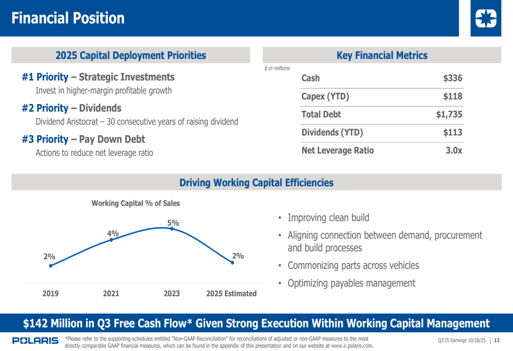 A Polaris mantém uma posição financeira sólida com US$ 336 milhões em caixa e US$ 1,735 bilhões em dívida total, resultando em um índice de alavancagem líquida de 3,0x. As prioridades de alocação de capital da empresa focam primeiro em investimentos estratégicos, seguidos por dividendos e redução da dívida.