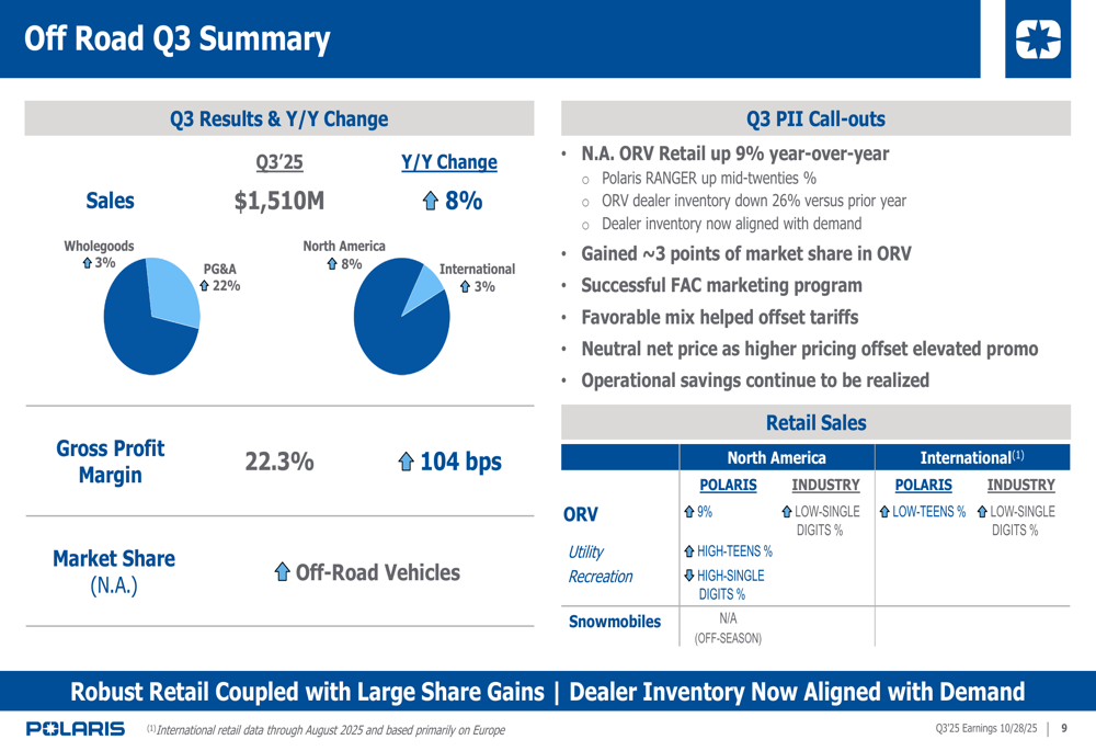 O segmento Off Road, a maior unidade de negócios da Polaris, entregou vendas de US$ 1,51 bilhões, um aumento de 8% em relação ao ano anterior, com uma margem de lucro bruto melhorada de 22,3% (aumento de 104 pontos base). A empresa ganhou aproximadamente 3 pontos de participação de mercado em ORV, com veículos utilitários crescendo em percentuais de dois dígitos altos.