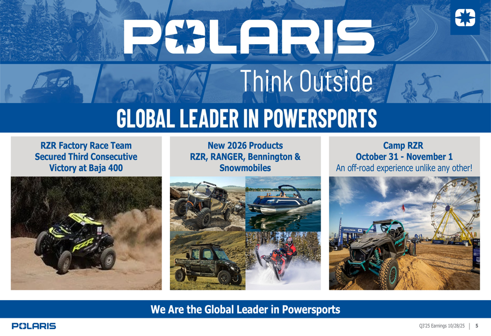 A Polaris continua a se posicionar como líder global em powersports, destacando inovações e lançamentos de novos produtos para 2026. A apresentação enfatizou o slogan "Think Outside" da empresa e mostrou seu diversificado portfólio de veículos.