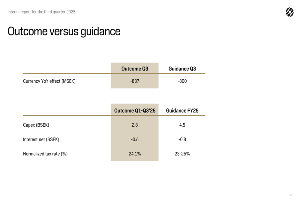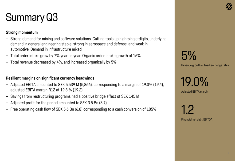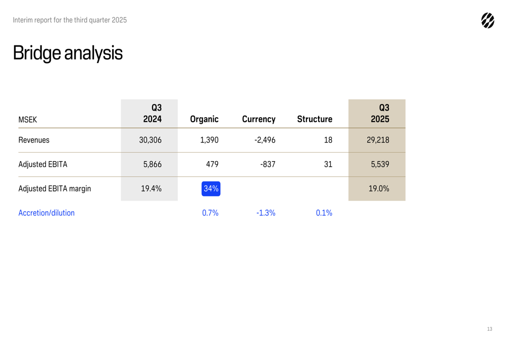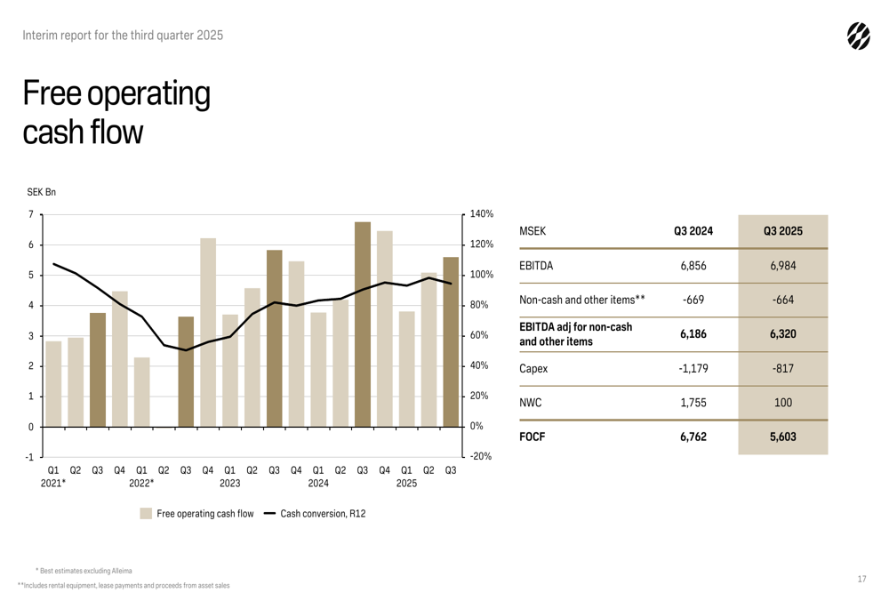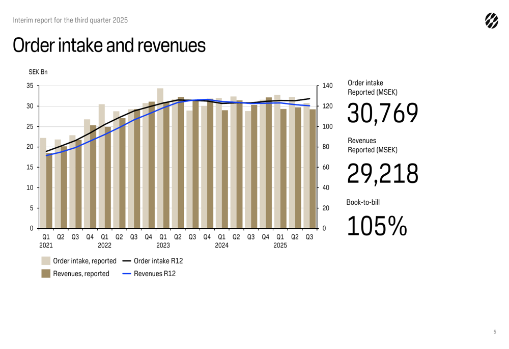 A receita diminuiu 4% para SEK 29,2 bilhões, mas aumentou 5% organicamente, novamente refletindo o significativo impacto cambial de -8%. O EBITA ajustado somou SEK 5,5 bilhões, correspondendo a uma margem de 19,0%, ligeiramente abaixo dos 19,4% reportados no 3º tri de 2024. No entanto, em uma base de 12 meses móveis, a margem EBITA ajustada melhorou para 19,3% de 19,2%.