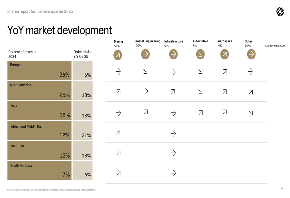 A Sandvik experimentou desempenho variado entre regiões, com crescimento particularmente forte na África e Oriente Médio (+31%), seguido por América do Norte, Ásia e Austrália (todos +18%). Europa e América do Sul mostraram crescimento mais modesto, de 6% cada.