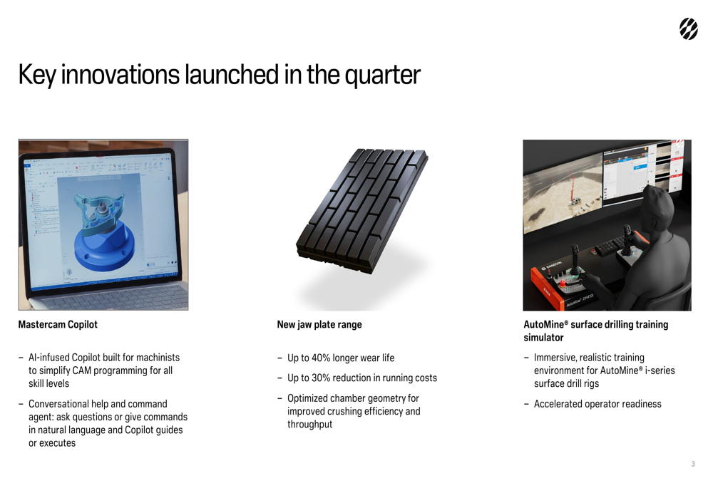 O trimestre viu a introdução do Mastercam Copilot, um assistente com inteligência artificial para operadores de máquinas que simplifica a programação CAM através de interação em linguagem natural. A empresa também lançou uma nova linha de placas de mandíbula oferecendo até 40% mais vida útil e 30% de redução nos custos operacionais, além de um simulador de treinamento AutoMine para perfuração de superfície para acelerar a preparação dos operadores.