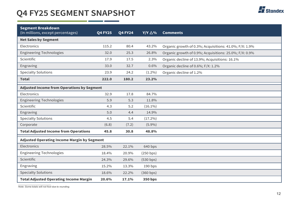 A Standex apresentou resultados financeiros excepcionais para o Q4 do ano fiscal de 2025, com vendas aumentando 23,2% em relação ao ano anterior, atingindo US$ 222,0 milhões. Esse crescimento foi impulsionado principalmente por aquisições (23,4%), com o crescimento orgânico contribuindo com modestos 1,4% e câmbio favorável adicionando 1,2%.