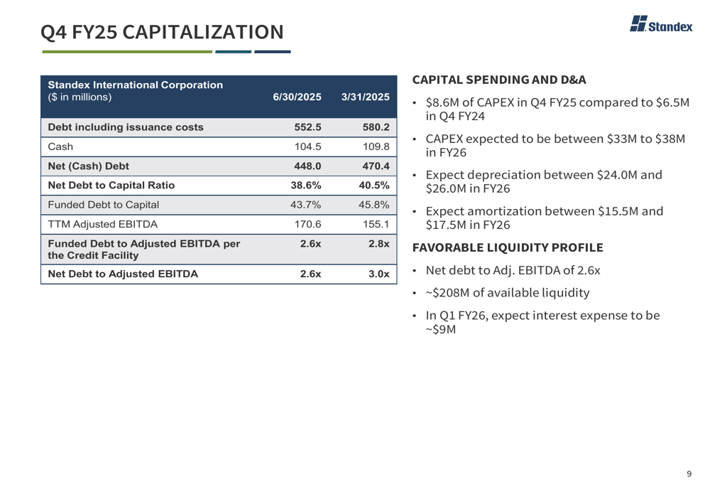 A Standex manteve uma forte posição financeira apesar da significativa atividade de aquisições. A empresa reduziu sua relação de dívida líquida para EBITDA ajustado para 2,6x em 30 de junho de 2025, abaixo de 3,0x no final do trimestre anterior. Essa melhoria foi impulsionada pela forte geração de caixa e repatriação de caixa.