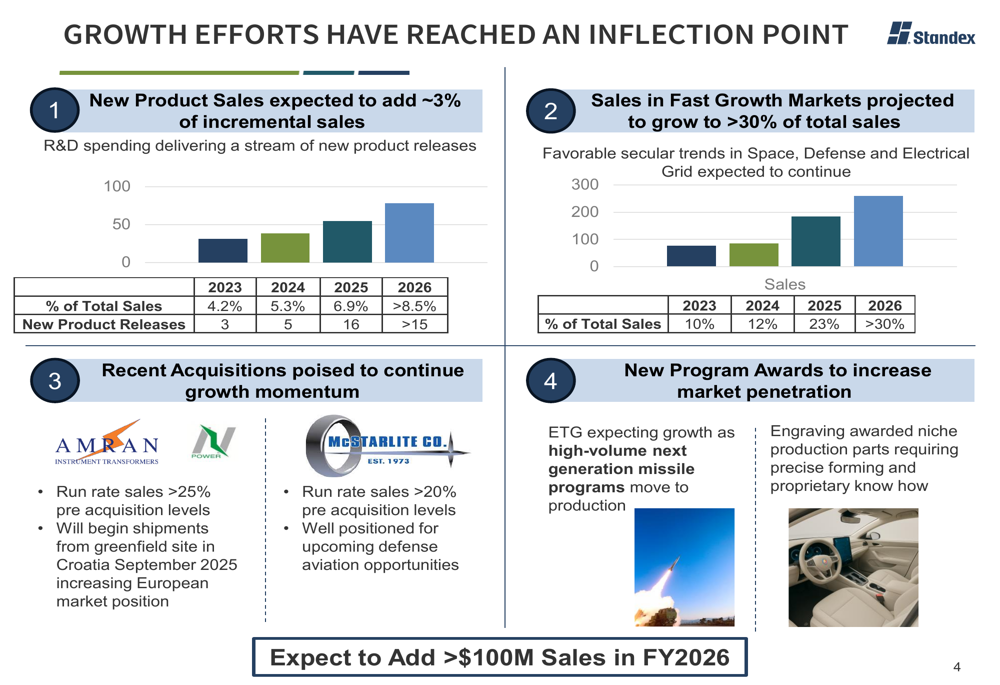A apresentação da Standex destacou várias iniciativas-chave de crescimento que atingiram um ponto de inflexão. A empresa concentrou-se estrategicamente em mercados de rápido crescimento, que agora representam aproximadamente 28% das vendas totais. Espera-se que esses mercados, incluindo Espaço, Defesa e Rede Elétrica, cresçam aproximadamente 45% ano a ano no ano fiscal de 2026, ultrapassando US$ 265 milhões em vendas.