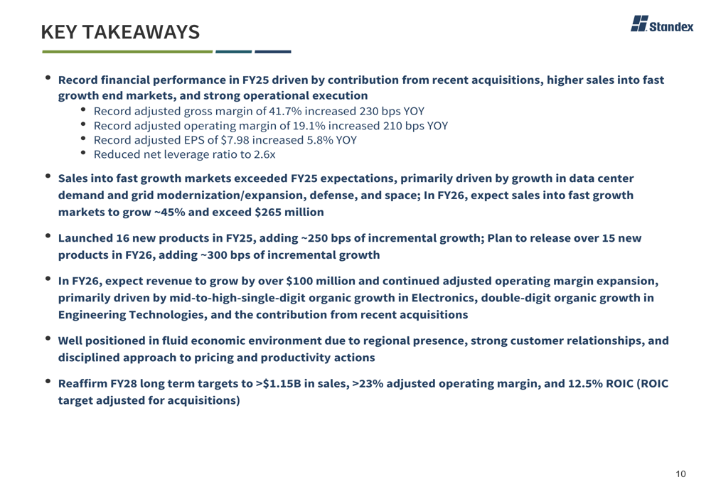 A Standex reafirmou suas metas de longo prazo para o ano fiscal de 2028, incluindo mais de US$ 1,15 bilhão em vendas, margem operacional ajustada excedendo 23% e retorno sobre capital investido de 12,5% (ajustado para aquisições).