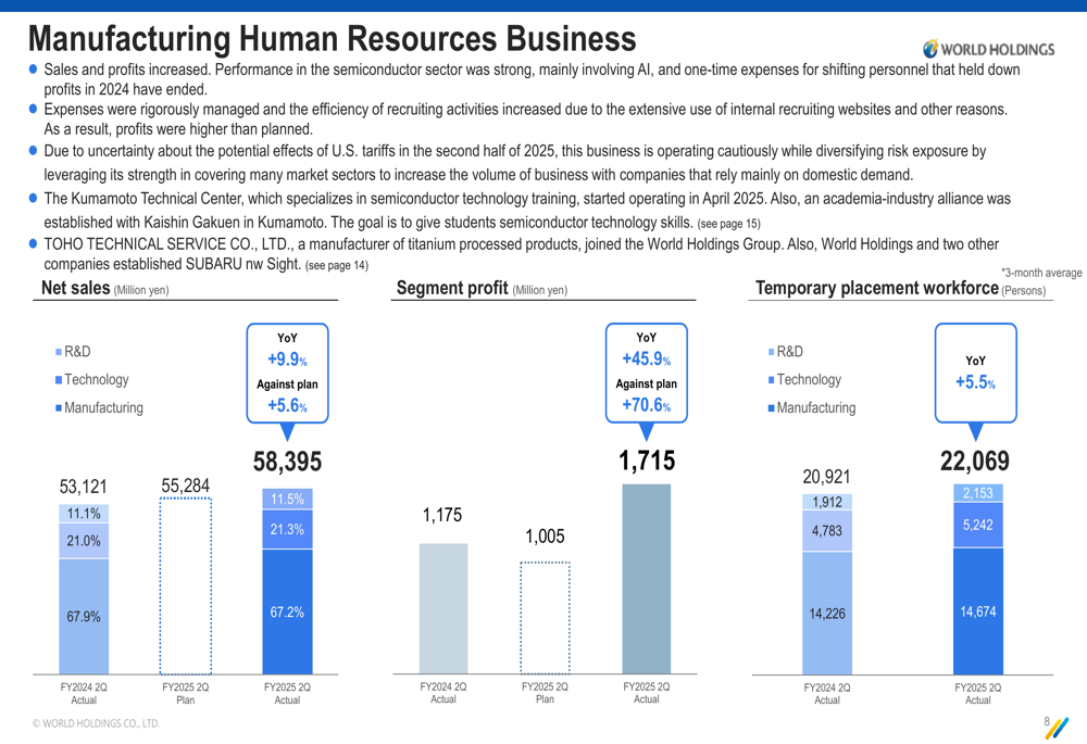 O Negócio de Recursos Humanos e Educação, que inclui Recursos Humanos para Manufatura e Serviços, viu as vendas líquidas aumentarem para 98.995 milhões de ienes com um lucro de segmento de 2.400 milhões de ienes. A divisão de Recursos Humanos para Manufatura se beneficiou significativamente da forte demanda no setor de semicondutores, como mostrado nesta análise detalhada: