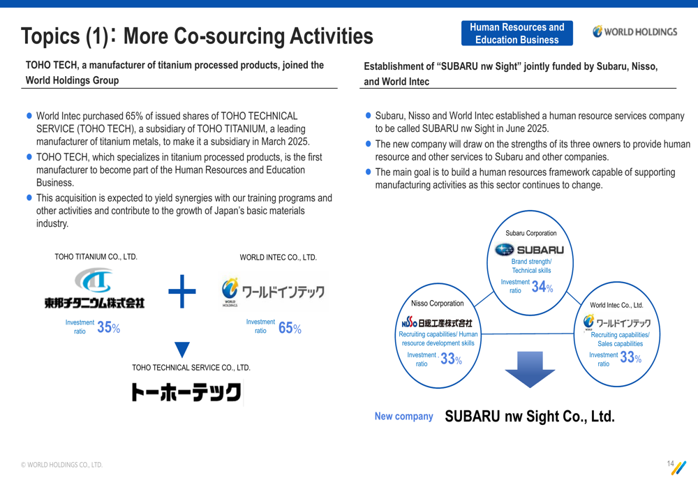 A empresa destacou atividades específicas de co-sourcing, incluindo a aquisição da fabricante de produtos processados de titânio TOHO TECH e uma joint venture com a Subaru e a Nisso para estabelecer a "SUBARU nw Sight", uma empresa especializada em serviços de recursos humanos: