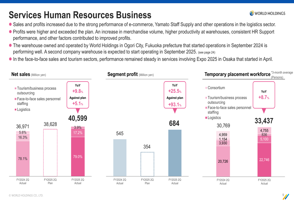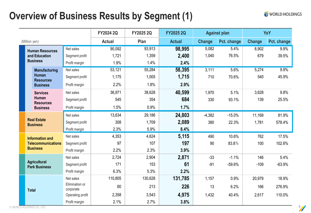 A World Holdings reportou resultados financeiros excepcionais para o 2º tri do ano fiscal de 2025, com crescimento de três dígitos no lucro operacional e desempenho significativamente superior ao planejado. As vendas líquidas atingiram 131.785 milhões de ienes, representando um aumento de 18,9% em relação ao ano anterior e superando o plano da empresa em 0,9%. Mais impressionante ainda, o lucro operacional aumentou 111,0% em relação ao ano anterior, chegando a 4.975 milhões de ienes, superando substancialmente os 3.543 milhões de ienes planejados.