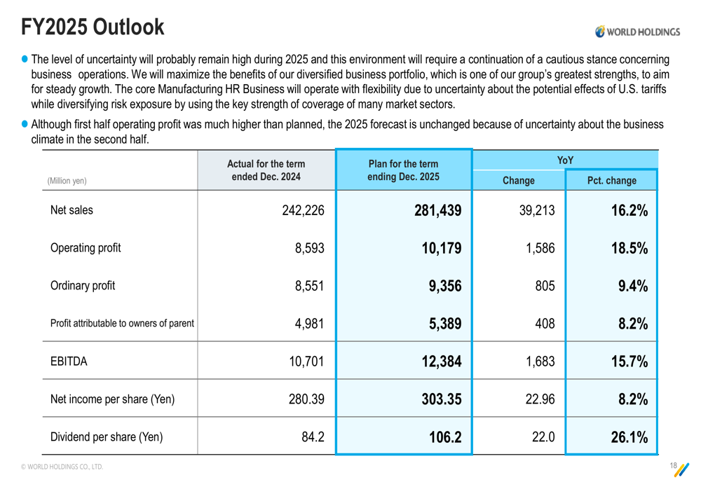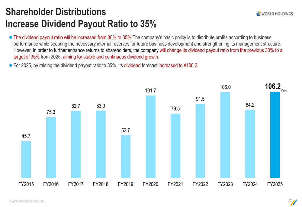 Em um movimento significativo para os investidores, a World Holdings anunciou um aumento em seu índice de pagamento de dividendos para 35%, resultando em um dividendo projetado por ação de 106,2 ienes para o ano fiscal de 2025, representando um aumento de 26,1% em relação ao ano anterior: