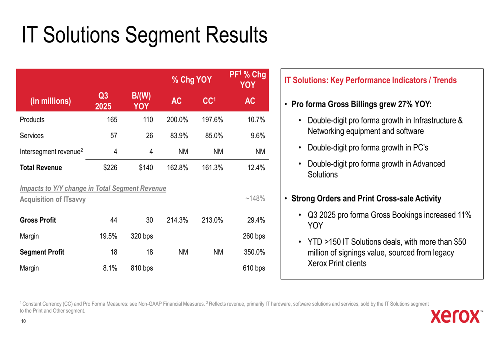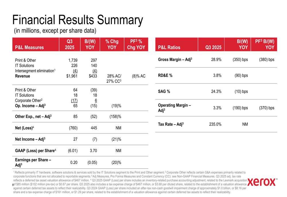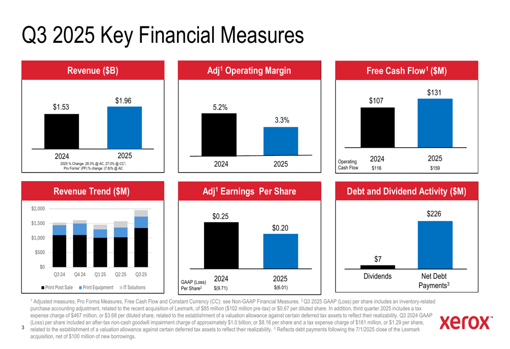 Os resultados do 3º tri 2025 da Xerox mostraram forte crescimento da receita, mas métricas de lucratividade em deterioração. A empresa reportou um aumento de receita de 28,3% em taxas de câmbio reais (27,0% em moeda constante), embora a receita pro forma tenha diminuído 7,8% quando consideradas as aquisições.