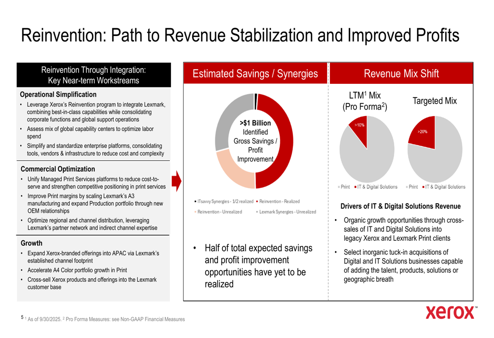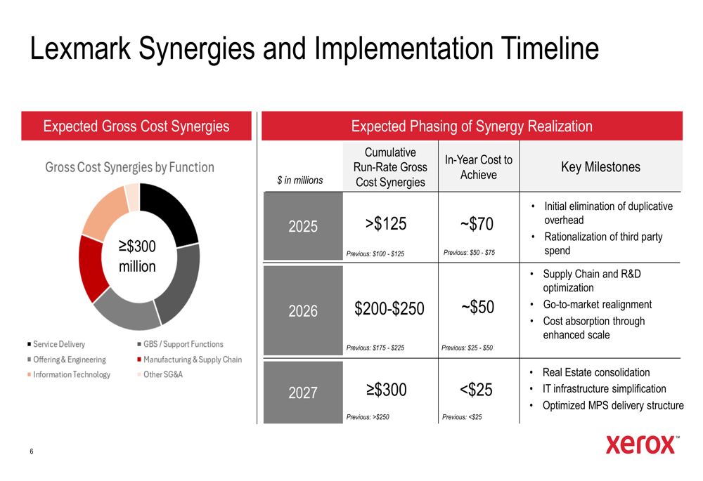 Um componente-chave da estratégia da Xerox envolve a obtenção de sinergias da aquisição da Lexmark. A empresa aumentou suas sinergias de custo bruto esperadas para mais de US$ 300 milhões, um aumento de US$ 50 milhões em relação às estimativas anteriores. Espera-se que essas sinergias sejam realizadas gradualmente até 2027, com mais de US$ 125 milhões em sinergias de custo bruto em taxa anualizada previstas até o final de 2025.