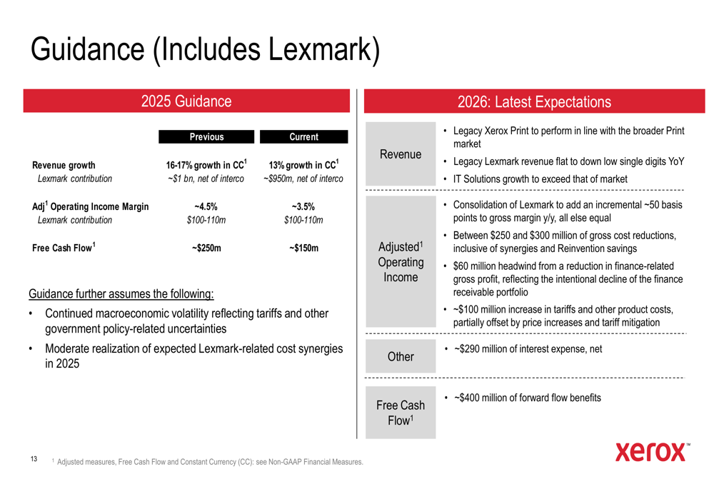 A Xerox delineou suas prioridades estratégicas focadas na execução de seu plano de reinvenção, na realização de benefícios de aquisições e no fortalecimento de seu balanço. A empresa está particularmente focada na integração da Lexmark, que adquiriu no início de 2025.