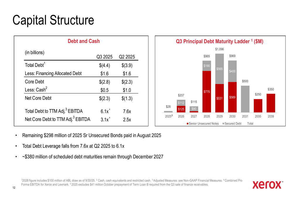 O balanço da Xerox reflete o impacto das aquisições recentes, com a dívida total aumentando para US$ 4,4 bilhões no 3º tri 2025, de US$ 3,9 bilhões no 2º tri 2025. O índice de alavancagem da empresa, medido como Dívida Total para EBITDA Ajustado dos últimos 12 meses, melhorou para 6,1x de 7,6x no trimestre anterior, embora a Dívida Líquida Principal para EBITDA Ajustado dos últimos 12 meses tenha piorado para 3,1x de 2,5x.