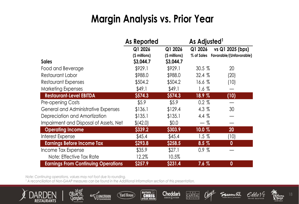 A Darden registrou vendas totais de US$ 3,0 bilhões no 1º tri, representando um aumento de 10,4% em relação ao ano anterior, com crescimento de 4,7% nas vendas de restaurantes comparáveis. A empresa reportou lucro por ação diluído ajustado de operações contínuas de US$ 1,97 e EBITDA ajustado de US$ 439 milhões. Durante o trimestre, a Darden devolveu US$ 358 milhões aos acionistas.