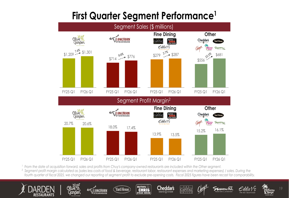 O desempenho por segmento da empresa mostrou resultados mistos em seu portfólio de restaurantes. O Olive Garden, maior marca da Darden, gerou US$ 1,3 bilhão em vendas, um aumento de 7,6% em relação ao ano anterior, enquanto manteve uma margem de lucro relativamente estável de 20,6%. O LongHorn Steakhouse viu suas vendas aumentarem 8,8% para US$ 776 milhões, embora sua margem de lucro tenha se contraído de 18,0% para 17,4% em relação ao ano anterior.