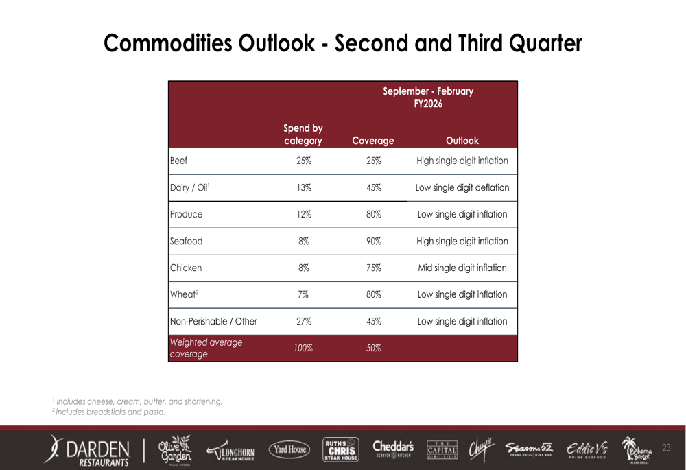 Olhando para o 2º tri e 3º tri do ano fiscal de 2026, a Darden espera pressões inflacionárias contínuas na maioria das categorias de commodities. A carne bovina, que representa 25% dos gastos com commodities da empresa, deve apresentar inflação de alto dígito único, enquanto os frutos do mar enfrentam pressão semelhante. A empresa tem níveis variados de cobertura em sua cesta de commodities, variando de 25% para carne bovina a 90% para frutos do mar.