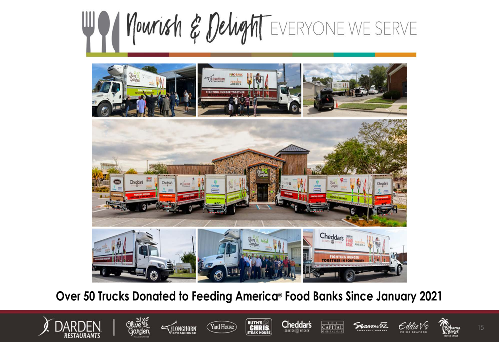 Além do crescimento dos negócios, a Darden enfatizou seu compromisso com a responsabilidade social através de sua parceria com a Feeding America, tendo doado mais de 50 food trucks para bancos de alimentos desde janeiro de 2021.