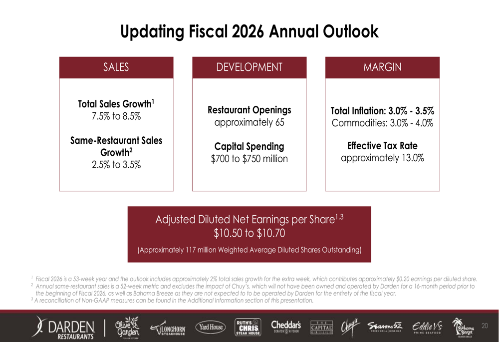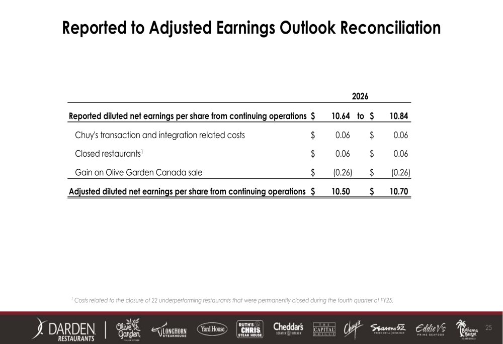 A perspectiva de lucros inclui vários ajustes, incluindo custos relacionados à transação e integração do Chuy’s, restaurantes fechados e um ganho na venda do Olive Garden Canadá. Esses ajustes preenchem a lacuna entre o lucro por ação reportado de US$ 10,64-US$ 10,84 e o lucro por ação ajustado de US$ 10,50-US$ 10,70.