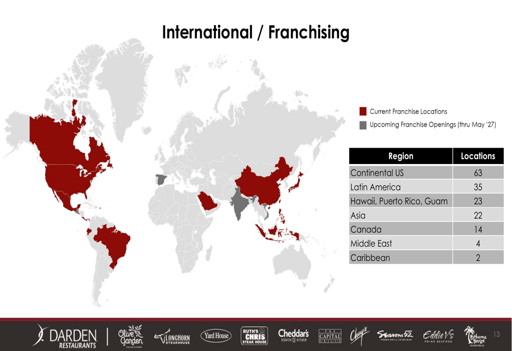 A Darden também está expandindo sua presença internacional através de franquias, com localizações em várias regiões globais. A presença global da empresa é visualizada neste mapa: