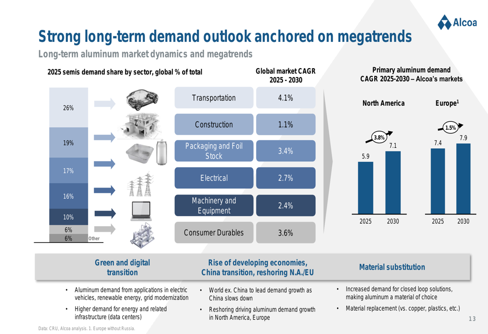 Olhando além de 2025, a Alcoa destacou fundamentos de demanda de longo prazo fortes para o alumínio, com taxas de crescimento anual compostas projetadas de 3,8% na América do Norte e 7,9% na Europa de 2025-2030: