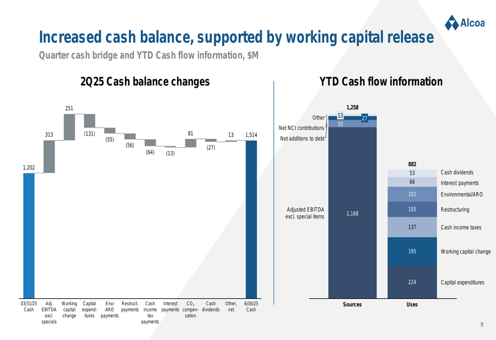 Apesar desses desafios, a Alcoa conseguiu aumentar seu saldo de caixa de US$ 1,202 bilhão no final do 1º tri para US$ 1,514 bilhão no final do 2º tri, apoiado pela liberação de capital de giro e outros fatores, como mostrado no seguinte fluxo de caixa:
